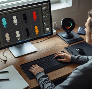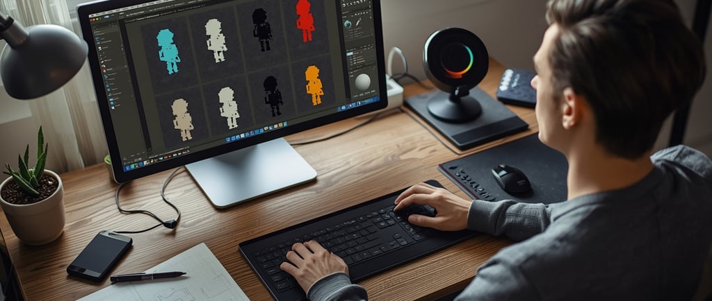 Ao trabalhar com pixel art, é essencial considerar a harmonização de tons. Limitar a paleta a um número restrito de cores pode, paradoxalmente, resultar em uma maior profundidade e detalhe. Usar várias tonalidades de uma mesma cor permite adicionar nuances e sombreamento, enquanto a introdução de uma ou duas cores contrastantes pode direcionar a atenção para áreas de interesse no design do personagem.